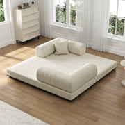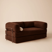 A 3-mode foldable sofa bed in matte fabric and solid wood.